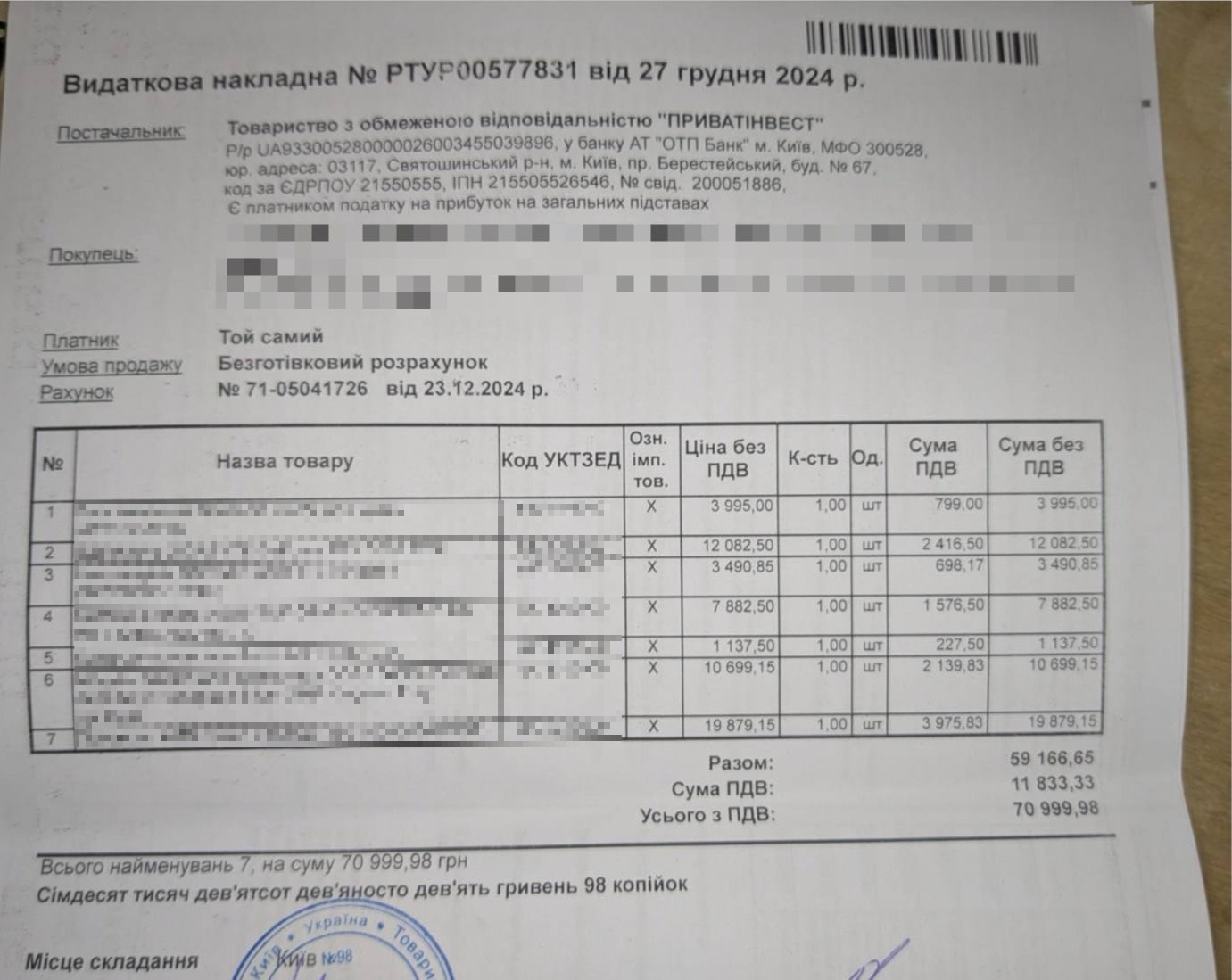 Публікуємо рахунок про оплату частини майна.